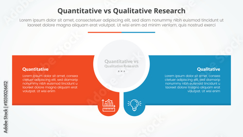 quantitative vs qualitative research data comparison opposite infographic concept for slide presentation with circle center and creative rectangle box with flat style