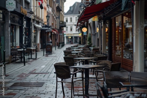 city, street, empty, cafes, closed, shop, eerie, silence, economic, impact, virus, outbreak, deserted, pandemic, urban, landscape, business, crisis, seating, social, quarantine, isolation, downtown, abandoned, struggle, public, health, safety, silent, chair, table, signs, pavement, pathway, dim, gloomy, solitude, stillness, quietness, financial