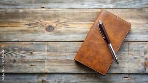 Quiet moment of reflection captured in photo of brown journal and pen on weathered whitewash wood