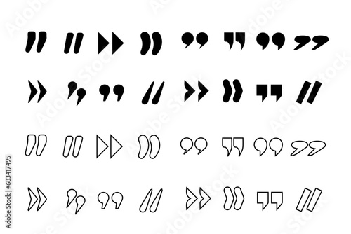 Quote mark vector set. Quotemarks outline, speech marks, inverted commas or talking marks collection. Talk bubble speech icon. Black quotes icon image and object.
