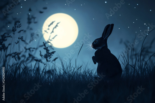 Rabbit standing on its hind legs in a moonlit meadow at night, enjoying the serene atmosphere