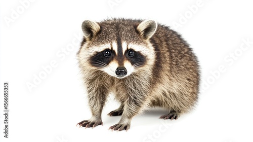 Raccoon isolated on white, facing the camera, standing and looking at viewer
