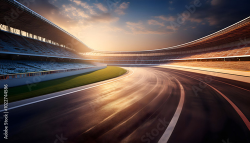 stadium, track, race track, curve, speedway, sunset, road, asphalt, quiet, twilight, competition, evening, light, racing, sport, field, lane, grandstand, sky, glow