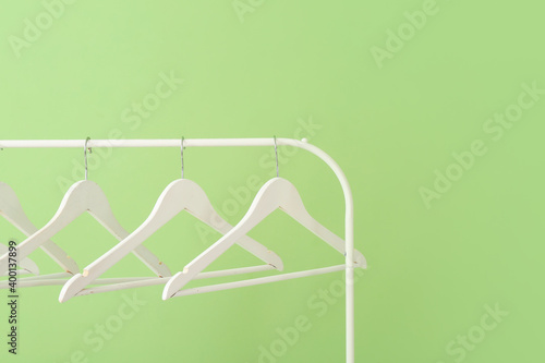Rack with clothes hangers on color background