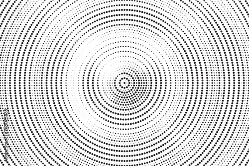Radial halftone gradient background. Dotted concentric texture with fading effect. Black and white circle shade wallpaper. Grunge rough vector. Monochrome backdrop