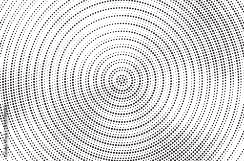 Radial halftone gradient background. Dotted concentric texture with fading effect. Black and white circle shade wallpaper. Grunge rough vector. Monochrome backdrop