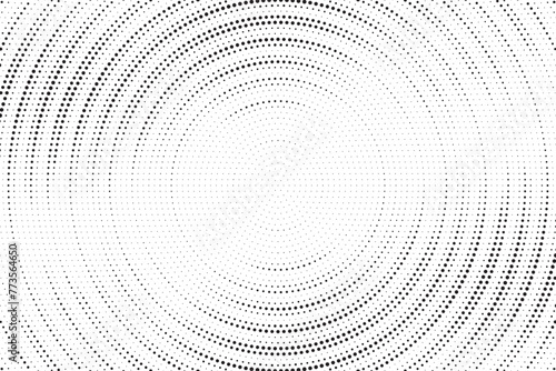Radial halftone spotted and dotted gradient background. Concentric stains texture with fading effect. Black and white rough wallpaper. Grunge monochrome geometric backdrop. Vector illustration.