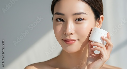 asian woman, beauty, health, wellness, natural beauty, simplicity, elegance, cosmetic, facial cream, moisturiser, face, make-up, studio shot, minimalist, modern, sophisticated, youthful, attractive, female, lifestyle, advertising, marketing, cosmetic product, dermatology, skincare, healthy lifestyle, beauty treatment