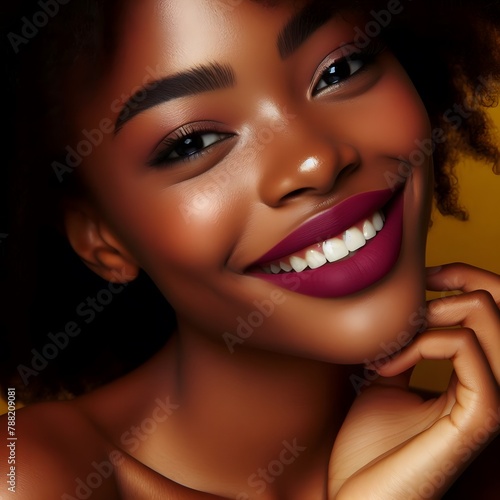 radiant, beauty, stunning, portrait, smiling, african, woman, flawless, skin, natural, curly, hair, bold, lipstick, confidence, elegance, joyful, vibrant, glow, fashion, style, allure, captivating, enchanting, chic, glamourous, striking, youthful, attractive