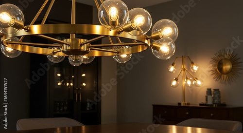 chandelier, lamp, light, lighting, fixture, bulb, filament, glasses, globe, orb, brass, metal, furniture, interior, room, home, house, dining, living, decor, decoration, design, table, sideboard, mirror, sunburst, modern, contemporary, elegant, luxury, luxurious, sophisticated, chic, stylish, upscale, classic, retro, vintage, ambience, atmosphere, mood, warmth, cosy, inviting, intimate, dramatic, beautiful
