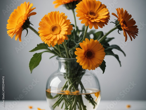 "Radiant Calendula Blooms: Glass Vase Display on White"