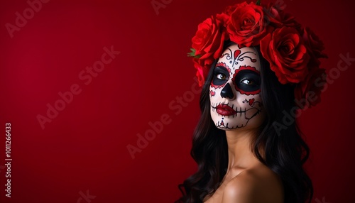 day of the dead, red background, copy space, radiant, expression, tradition, culture, flower, rose, beauty, heritage, festival, art, make-up, colourful, festive, skull, floral, headpiece, costume, holiday, remembrance, spirit, joy, honour, ritual, festivity, cultural, mexican, identity, symbolic, high-coloured, lively