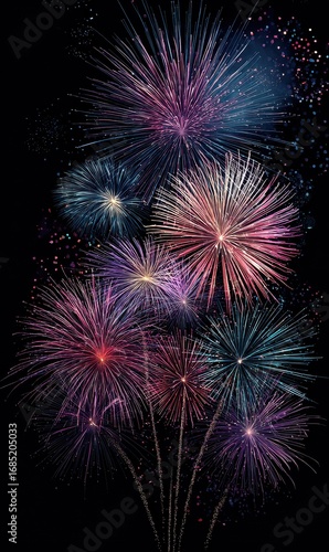 Radiant fireworks with colorful explosions on a dark backdrop, Celebration, dazzling night festivity