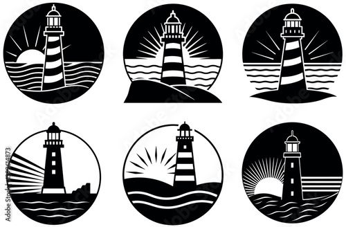 Radiant Lighthouse Silhouette Vector with Bold Sun Rays and Ocean Waves – Nautical Clipart for Sublimation, Coastal Decor, Sea Navigation Crafts, Cricut Projects, and Beachwear T-Shirt Designs