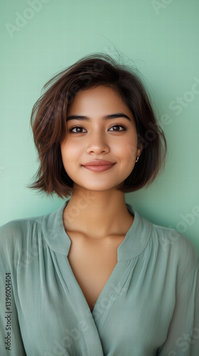Radiant Portrait of a Woman: A stunning portrait of a young woman with a captivating gaze and an engaging smile, exuding confidence and natural beauty.