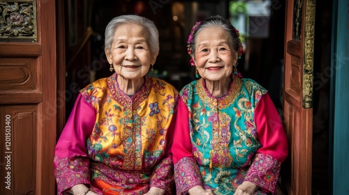 Radiant Singaporean Elderly Twin Sisters in Traditional Peranakan Attire Embracing Bright Colors