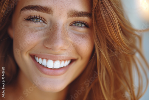 woman, smile, beauty, happiness, radiant, cheerful, young, female, joyful, closeup, natural, teeth, hair, skincare, healthy, glowing, fresh, positive, freckle, expression, joy, bright, confidence, head shot, well-being, portrait, caucasian, attractive, adult, emotion, person, vibrant, face, glow, casual attire, authentic, lifestyle, wellness, optimism, generative, ai, smiling, happy, anonymous, unrecognizable, crop, blond