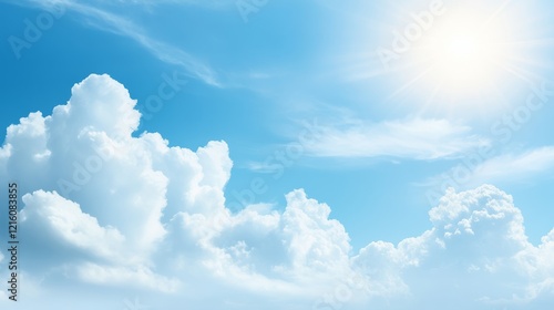 Radiant sun and fluffy white clouds adorn a vibrant blue sky in serene picturesque display of nature's beauty