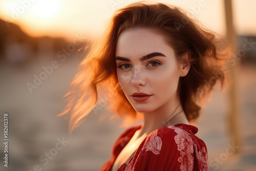 Radiant Woman with luscious red lips and a confident gaze posing on a sandy beach at sunset, generative ai