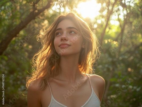 Radiant Young Woman Embracing Nature in Sunlit Forest