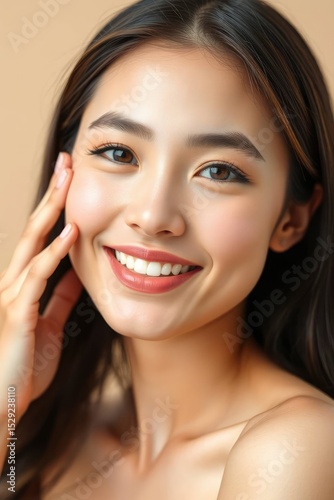 woman, portrait, beauty, skin, smile, happy, asian, face, model, young, cheerful, attractive, glowing, healthy, brunette, hair, eye, make-up, cosmetic, youth, feminine, wellness, skincare, clean, fresh, complexion, natural, pretty, girl, person, one person, touching, minimalist, portraiture, closeup, studio shot, well-being, youthful, harmony, radiant, soft light, gentle, natural light