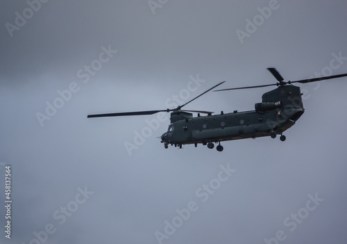 RAF Chinook tandem-rotor CH-47 helicopter flying fast and low in a cloudy blue grey sky on a military battle exercise, Wilts UK