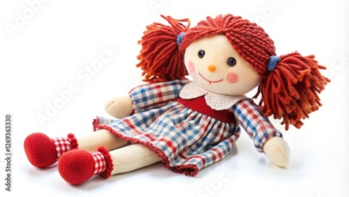 doll, rag, toy, fabric, textile, hand-made, craft, red, hair, threaded, dress, plaid, chequered, shoe, boot, isolated, white, background, studio, photo, object, children, play, cute, cheerful, smiling, happy, simple, art, design, vintage, retro, classic, childhood, girl, feminine, soft, cuddly, cotton, wool, stitch, seam, handcraft
