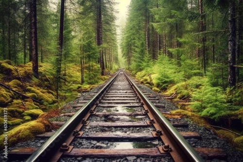 Railroad tracks in a forest landscape. Illustration AI Generative