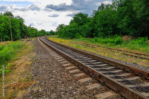 railroad, railway, landscape, track, travel, steel, transportation, rail, nature, train, road, way, iron, journey, sky, line, perspective, green, industrial, metal, forest, path, direction, old, transit, station, speed, summer, background, country, rural, tree, locomotive, grass, sun, gravel, rust-eaten, abandoned, cargo, crossing, tour tourism, concept, shipping, ballast, motion, heavy, bridge, logistic
