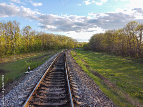 Railway, tracks through tree planting, green grass and beautiful nature, travel through Ukrainian steppes and forests.