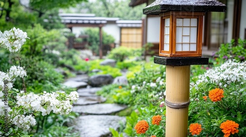zen garden, rain, japanese garden, flower, calmness, serenity, nature, landscape, water feature, plant, blooming, white flower, orange flower, peaceful, calm, green, scenery, spring, summer, pathway, rock, wet, moist, garden design, meditation, relaxation, atmosphere, ambience, aesthetic, beauty, natural, elegant, simple, minimalist, rustic, quiet, solitude, contemplation