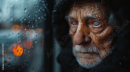 Rain streaked window obscuring view of car lights, creating a mysterious and abstract atmosphere