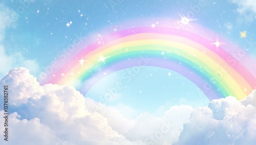 rainbow, cloud, star, sky, arch, illuminated, pastel, sparkle, glowing, fluffy, daydream, dreamy, fantasy, scenery, heaven, celestial, illustration, whimsical, soft, shining, colourful, spectrum, weather, gradient, aethereal, light, background, air, atmosphere, magic, abstract, graphic, design, cartoon, art, element, decorative, artwork, children
