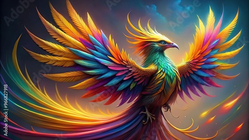 Rainbow feathered phoenix Chinese firebird with gold wings in long plumage long shot