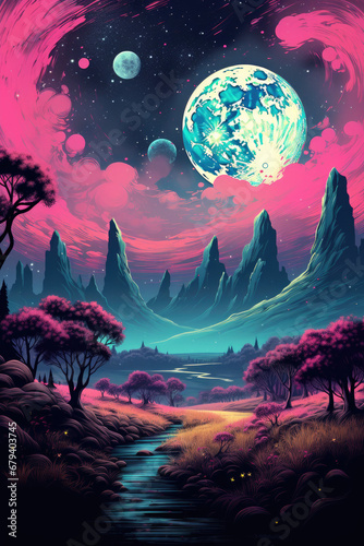 Rainbow Landscape on Alien Planet, Rainbow markers vibrant illustration