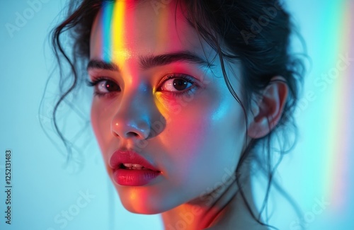 Rainbow light on woman face, neon portrait. Beautiful girl, glitched female face. Beauty art for fashion, young model. Blue pink red color, colorful background with shadow.