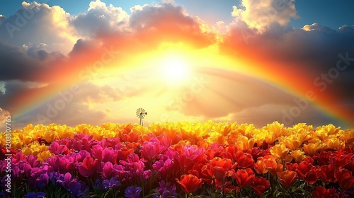 tulip, rainbow, sunset, field, flower, sky, nature, colours, vibrant, spring, sunshine, landscape, scenic, beautiful, colourful, amazing, bright, gold, cloud, horizon, windmill, rural, idylli, serene, peaceful, tranquil, hope, joy, wonder, magic, dreamy, fantasy, artistic, photo, image, photo, picture, visual, art, spectacular