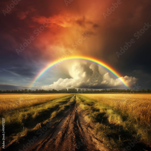 Rainbow Road to Hope: A breathtaking view of a dirt road leading towards a vibrant rainbow arching across a dramatic sky, promising hope and renewal after a storm. The golden wheat field adds to the s