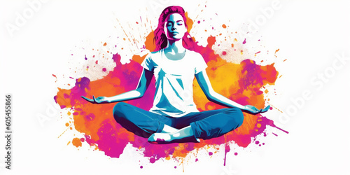 Rainbow silhouette of happy yoga girls. Contemporary art collage of young girl meditating, doing yoga. Concept of art, creativity, healthy lifestyle. International day of yoga. AI Generated