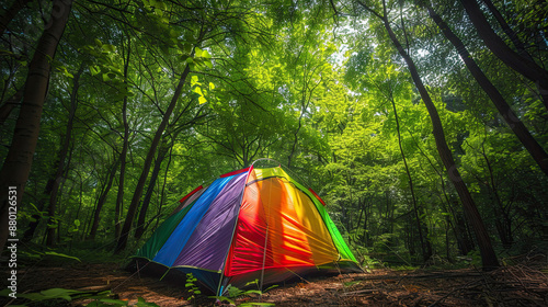 Rainbow Tent in Forest Clearing