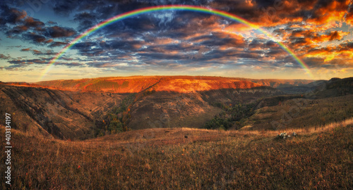 rainbow, spectrum, glowing, fantasy, dream, colouring, nature, earth, scenery, autumn, fall, autumn, seasonal, outdoors, sky, elevation, calmness, vacation, rock, scenic, cloud, shadow, many-coloured, colours, dramatic, aethereal, sunrise, meadow, pasture, sunlight, amazing, dramatic sky, morning, peak, national park, mountain, height, travel, explore, trip, trekking, relaxation, quiet, serenity, tranquil scene, tree, discovery, stone, ukraine