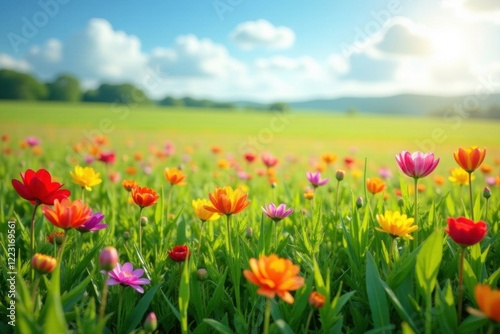 Rainbow-colored flowers in a field of tall grass, landscape, fields