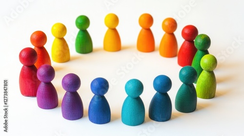 Rainbow-hued wooden figurines standing in a circle on a white background, promoting diversity and togetherness