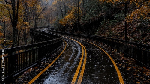 road, rain, autumn, forest, tree, leaf, curve, path, nature, landscape, travel, scenic, fall, wet, yellow, line, wood, bridge, pathway, winding, drive, journey, background, season, weather, photo, image, picture, view, beautiful, colours, dark, fog, mist, adventure, explore, relaxation, peaceful, serene, calm, quiet, solitude, wood, moody