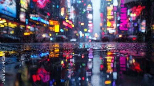 Rainy City Night with Neon Lights Reflection