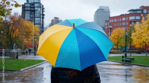 Rainy city park scene, colorful umbrella, urban backdrop, wet pavement, autumn foliage, overcast day, pedestrian activity, rainy weather, walking