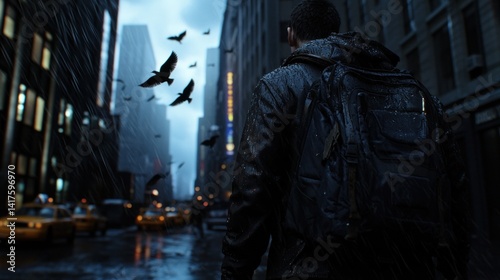 man, walking, city, rain, urban, crow, street, dark, rainy, night, travel, new york city, storm, weather, city landscape, backpack, perspective, person, back, stormy, downtown, atmosphere, gloomy, rainstorm, evening, lonely, moody