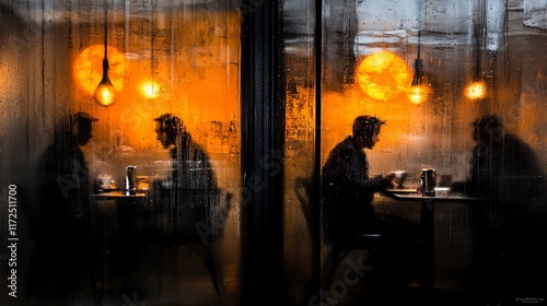 rain, window, cafes, hot drink, shop, people, man, sitting, table, chair, warm, light, lamp, orange, dark, silhouette, wet, glasses, city, urban, evening, night, moody, atmosphere, cosy, interior, eatery, pensive, contemplative, alone, together, quiet, stillness, sombre, mysterious, dramatic, blurred, abstract, view, scene, image, photo