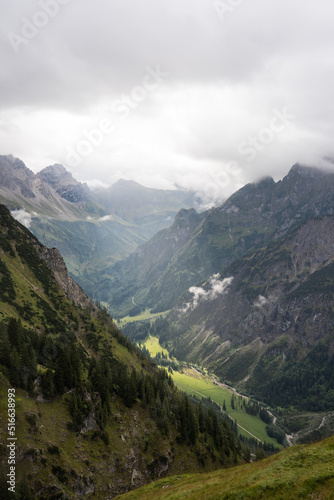 alps, fog, mist, moody, rainy, morning, green, mountain, hiking, vale, landscape, wanderlust, adventure, cloud, nature, rock, hill, peak, alpine