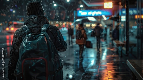 rainy, evening, commute, city, urban, pedestrian, backpack, street, light, wet, pavement, weather, night, bokeh, glow, bus stop, public transport, reflective, illumination, walking, winter, coat, hood, nightlife, sidewalk, traffic, lifestyle, street light, cold, travel, water, droplet, season, city landscape, atmosphere, moody, person, alone, inclement, shelter, commuting, bustling, fluorescent, neon, city life, blurry, transit